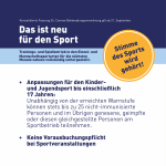 Darüber hinaus gibt es in der neuen Fassung der Corona-Bekämpfungsverordnung auch bürokratische Erleichterungen für die Sportvereine. So entfällt bis zu einer eingeführten Bagatellgrenze auch die sogenannte Vorausbuchungspflicht für Veranstaltungen bzw. der Zuschauer*innen im Innen- und Außenbereich.