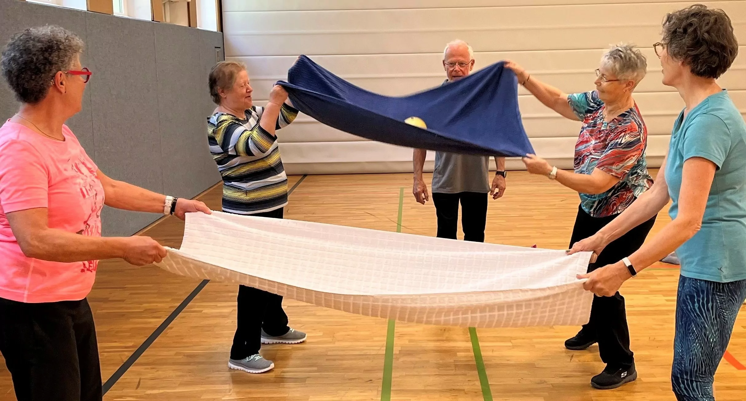 - Jeweils 2 Partner halten ein großes Handtuch und werfen damit einem zweiten Paar einen Luftballon zu. (Abbildung 1)