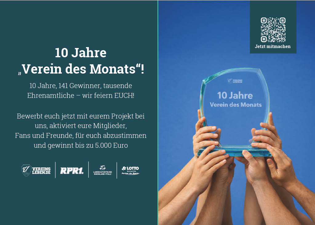 Vereinsleben.de richtet gemeinsam mit den regionalen Sportbünden Pfalz, Rheinland und Rheinhessen, dem Landessportbund Rheinland-Pfalz und der Sparda-Bank Südwest auch 2026 den Wettbewerb »Verein des Monats« aus. Dabei dürfen sich die Teilnehmenden über attraktive Gewinne freuen: Für die Monatsgewinner gibt es jeweils 5.000 Euro. Auch die Plätze zwei und drei werden mit Preisgeldern belohnt – sie erhalten 2.000 Euro beziehungsweise 1.000 Euro. Insgesamt werden damit Preisgelder im Gesamtwert von knapp 50.000 Euro an Sportvereine aus Rheinland-Pfalz und dem Saarland ausgeschüttet. Zur Verfügung gestellt wird der Gewinn vom Gewinnsparverein der Sparda-Bank Südwest.