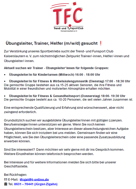 Bei Interesse bitten wir um Kontaktaufnahme unter E info@gsv-hauenstein.de